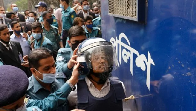Police escort a convicted man (R) after a Bangladesh anti-terrorism court sentenced five Islamist extremists to death over the brutal murder of Avijit Roy, a Bangladeshi-US writer and rights activist, in Dhaka. AFP